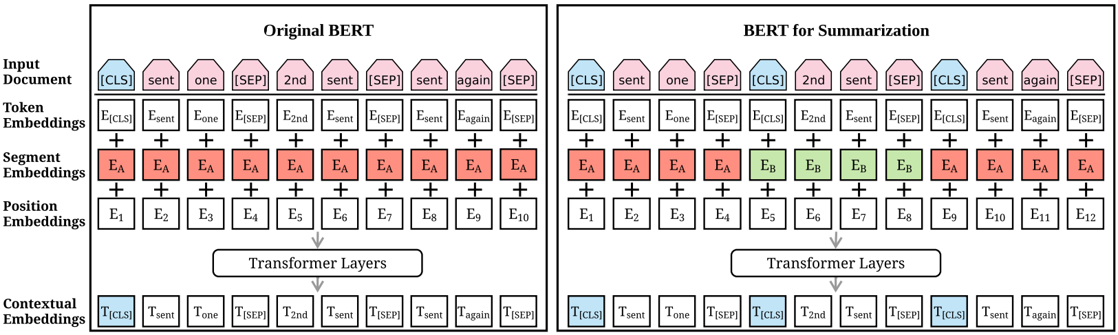 - 버트에서 [SEP]를 통해 문장을 구분해 임베딩할 수 있지만, 2개의 문장만 구분할 수 있다. 요약에서는 2개가 아닌 여러개의 문장을 인코딩해야한다.