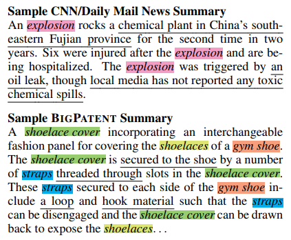- BIGPATENT 요약문에 출현하는 문장 조각의 길이가 이 더 짧음
