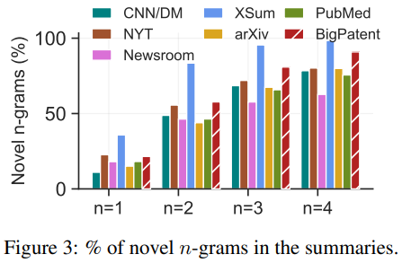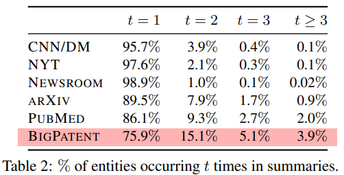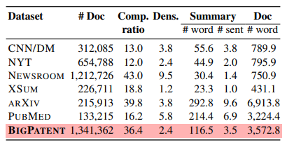 - BIGPATENT는 요약문의 길이도 길며, 원문의 긴 문장 조각을 그대로 가져오지도 않은 편