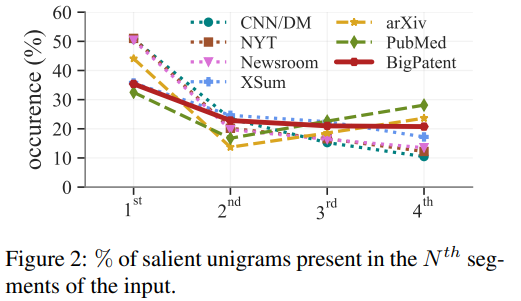 - BIGPATENT는 중요 단어가 1,2,3,4번째 문단에 비교적 고르게 분포하고 있음